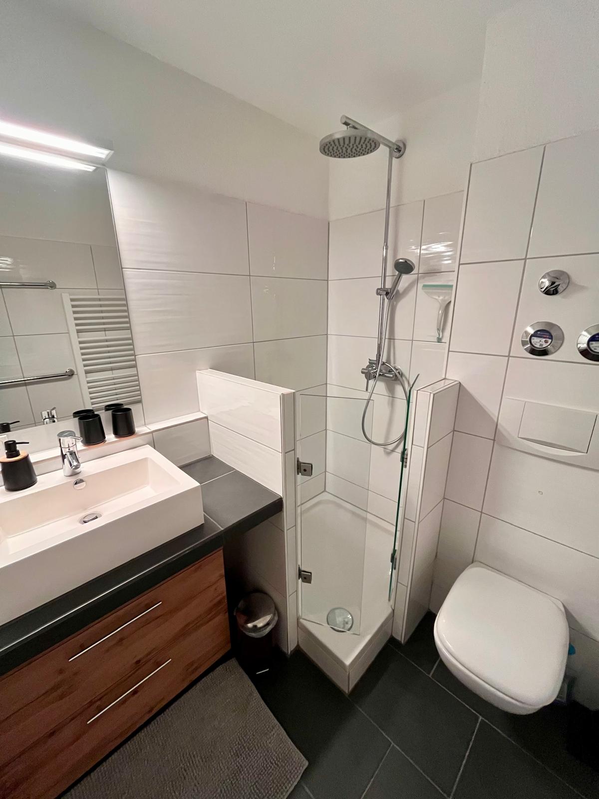 Das neu renovierte Bad bietet Ihnen eine Dusche, WC und ein Waschbecken sowie Hand- und Duschtücher.